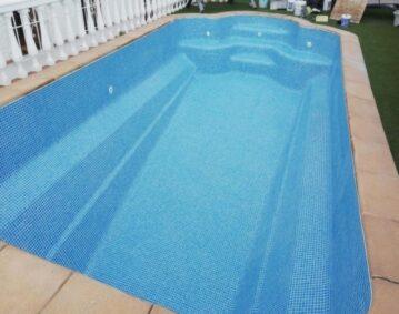 Revêtement d´une splendide piscine de coque avec une finition en pose de la mosaïque de la gamme Iris de fiches 2,5×2.5 cm. La piscine avait été peint plusieurs fois, puis revêtir d’une couche de Gel-coat. Mais au final le client …